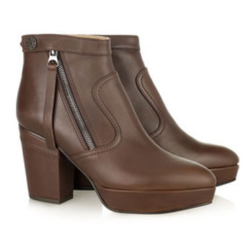 Acne棕色皮革脚踝靴后跟大约9cm防水台4cm。靴头为杏仁形,不对称拉链,脚踝有皮带暗扣。此T台款‘Track’靴属本季品牌必有品。采用高级巧克力棕色的皮革,给每个造型点缀出斯德哥尔摩的时尚。