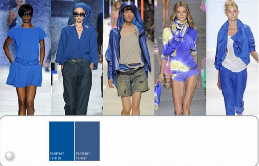 宝蓝色是前一季里非常关键的一个色调,在本季里也是同样的重要,只不过已经出现了下滑趋势,有一部分已经为长春花色所代替。但是宝蓝色仍然是非常明亮的,是“未来实验室”主题和“战士”主题下的重要表现形式。它是艳丽的蓝色,同时也向色调的更深处进发,或是倾向于刚青色。