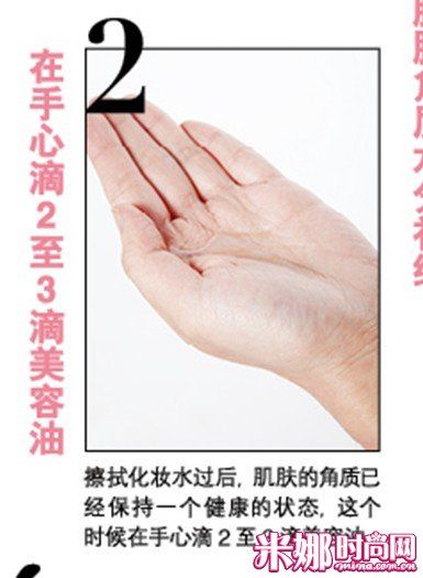 擦拭化妆水过后,肌肤的角质已经保持一个健康的状态,这个时候在手心滴2至3滴美容油。