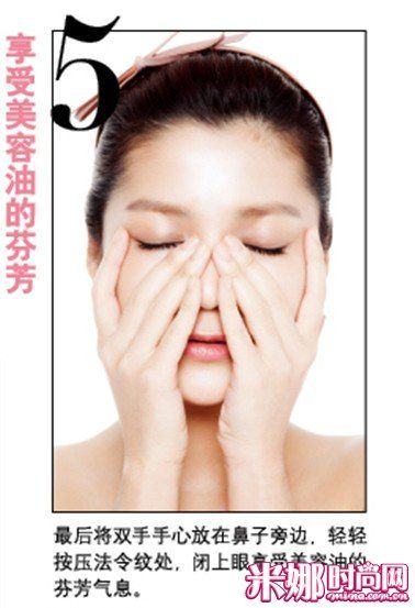 最后将双手手心放在鼻子旁边,轻轻按压法令纹处,闭上眼享受美容油的芬芳气息。