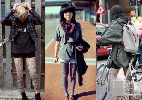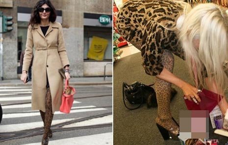 时尚编辑Giovanna Battaglia豹纹凉鞋+豹纹丝袜;豹纹长Tee+豹纹丝袜,因为质地和斑纹不一样,搭在一起也别有风格