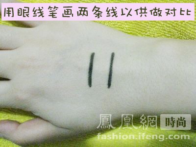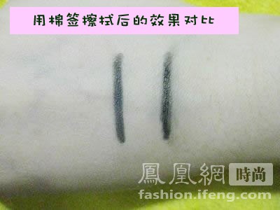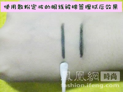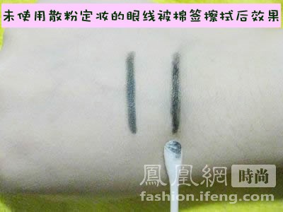 先做一个简单的对比,手上用灰常容易晕染的眼线笔画两条线,一条铺上薄薄一层蜜丝佛陀散粉,另一条保持原状。用棉签轻轻擦拭,查看定妆效果。
