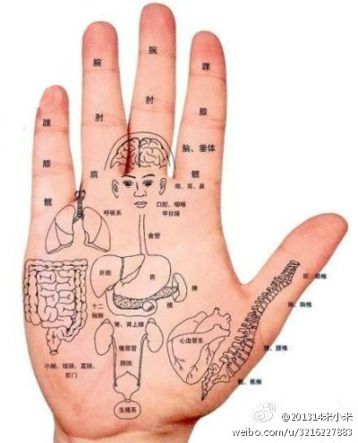 人的手掌与人的全身器官有着千丝万缕的联系,在适当的位置进行按摩,可以起到调节生理机能,促进气血平衡的作用。附上体表映像之掌部脏腑对应图一张,让保健更好的有的放矢。没事就按摩一下吧!