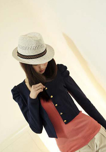 深蓝色的英伦风小外套,在金属纽扣的点缀下,散发出熠熠光辉,颇有些复古怀旧的味道,泡泡袖处理,更显甜美可爱,无论下身搭配裙子还是裤子,都洋溢活泼青春的味道。