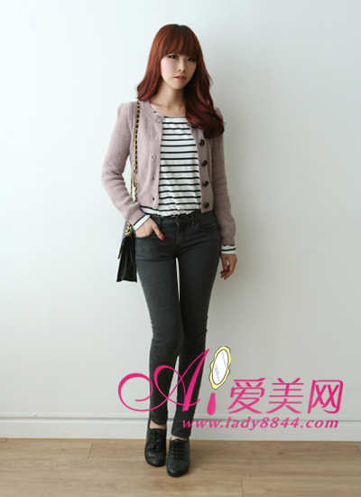 淡雅的粉紫色小外套,搭配显瘦条纹T恤以及紧身裤,再搭配一双与裤子同色系的鞋子,比例瞬间完美,立即增加5cm,虽然这样的季节不能实施短打方案,但是搭配小外套可是有提升比例的作用,矮个子女生不妨在秋日尝试下如此搭配,当然,一双跟裤子或者裤袜同色系的高跟鞋或者内增高鞋可是十分重要的。