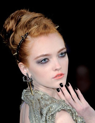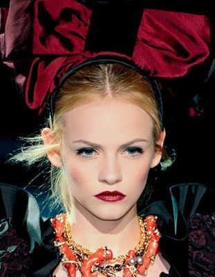 蓝眼睛配上蓝眼影,烈焰红唇衬托白皙肌肤,这个红唇比一般的还要深,真的像血一样的颜色。有人欣赏就会有人尝试,有人觉得夸张,但就是个性魅力。