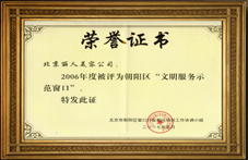 北京市朝阳区窗口行业奥运培训工作协调小组颁发文明服务示范窗口荣誉证书